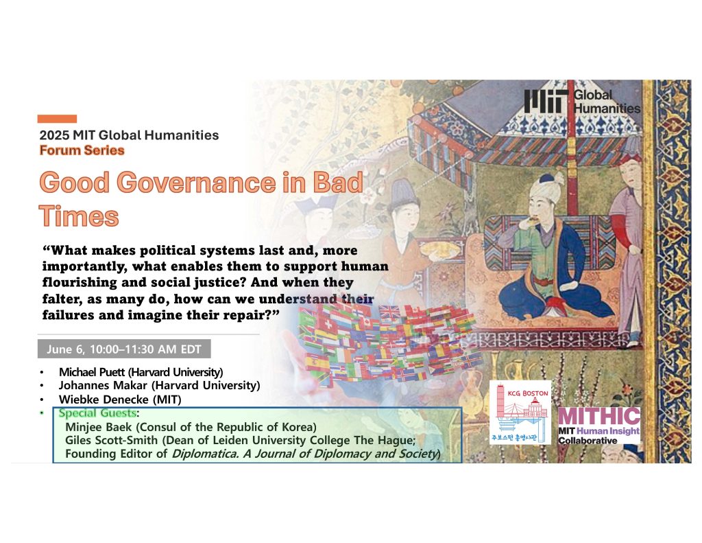 What makes political systems last and, more importantly, what enables them to support human flourishing and social justice? And when they falter, as many do, how can we understand their failures and imagine their repair? This panel discusses the work of GIH’s Good Governance in Bad Times pillar. The pillar explores models of governance from global history that have worked to foster cohesion and cooperation. Through key sources in world literature, philosophy, and political thought, it examines the forms of political imagination that have allowed communities to endure—and sometimes transform—in moments of crisis. The roundtable will spotlight the Comparatives Diplomacies project, a collaborative research project under GHI’s Governance pillar, which investigates how diplomacy and political authority have been mediated, narrated, and challenged across cultural contexts—and how this has positively impacted diplomatic leadership and practice. The panel will begin with short vignettes introducing the project through the eyes of each panelists’ expertise. It will conclude with a performance by Baek Minji, the Consul of the Republic of Korea in Boston, in which she will reflect on the power of literature for diplomatic imagination and practice.