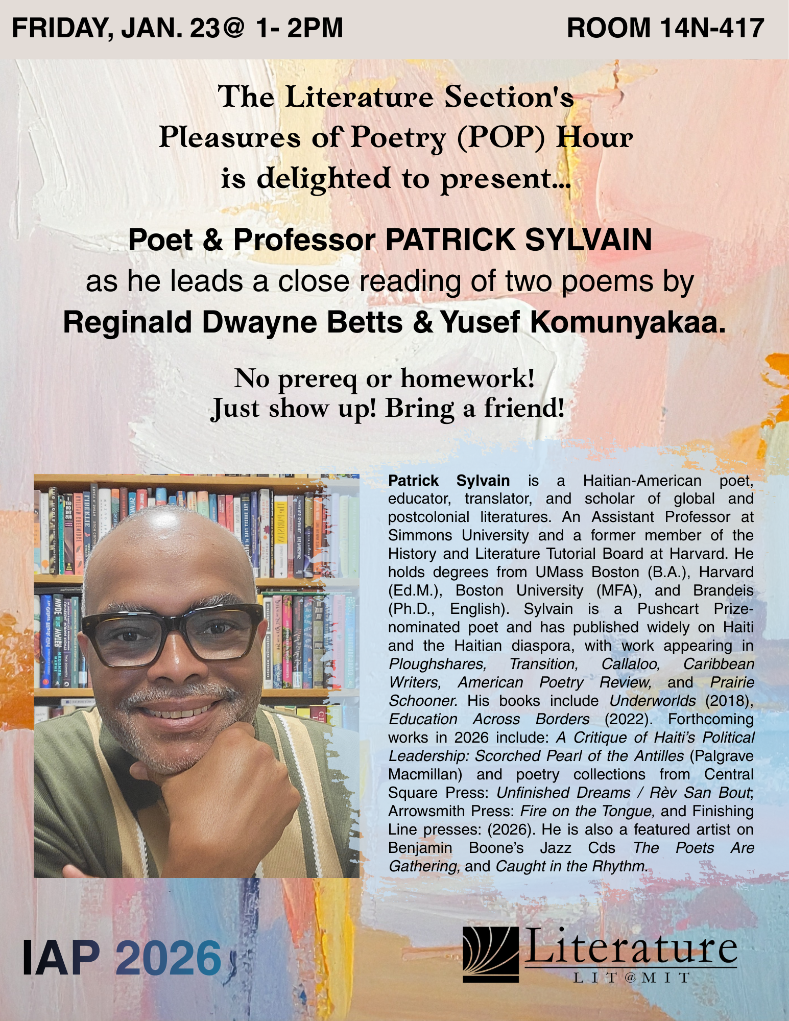 Patrick Sylvain is a Haitian-American poet, educator, translator, and scholar of global and postcolonial literatures. An Assistant Professor at Simmons University and a former member of the History and Literature Tutorial Board at Harvard. He holds degrees from UMass Boston (B.A.), Harvard (Ed.M.), Boston University (MFA), and Brandeis (Ph.D., English). Sylvain is a Pushcart Prize-nominated poet and has published widely on Haiti and the Haitian diaspora, with work appearing in Ploughshares, Transition, Callaloo, Caribbean Writers, American Poetry Review, and Prairie Schooner. His books include Underworlds (2018), Education Across Borders(2022). Forthcoming works in 2026 include: A Critique of Haiti’s Political Leadership: Scorched Pearl of the Antilles (Palgrave Macmillan) and poetry collections from Central Square Press: Unfinished Dreams / Rèv San Bout; Arrowsmith Press: Fire on the Tongue, and Finishing Line presses: (2026). He is also a featured artist on Benjamin Boone’s Jazz Cds The Poets Are Gathering, and Caught in the Rhythm.