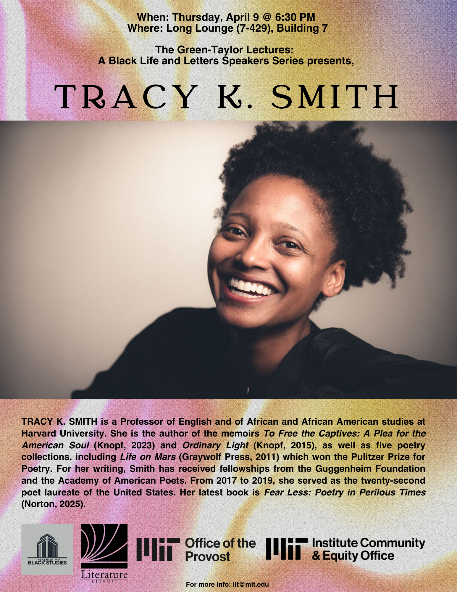 Tracy K. Smith is a Professor of English and of African and African American studies at Harvard University. She is the author of the memoirs To Free the Captives: A Plea for the American Soul (Knopf, 2023) and Ordinary Light (Knopf, 2015), as well as five poetry collections, including Life on Mars (Graywolf Press, 2011) which won the Pulitzer Prize for Poetry. For her writing, Smith has received fellowships from the Guggenheim Foundation and the Academy of American Poets. From 2017 to 2019, she served as the twenty-second poet laureate of the United States. Her latest book is Fear Less: Poetry in Perilous Times (Norton, 2025). The Green-Taylor Lectures is a speaker series celebrating the intersections of Black Studies, Architecture and Design. Over the course of the year, the series will feature voices from across these fields in an effort to illuminate both the unique history of African American architects here at MIT—the Institute's first Black graduate, Robert R. Taylor, as well as two of the first Black women to attend MIT, Marie Turner and Gloria Green, all studied architecture during their time on campus—and contemporary work in the field that honors the role of worldmaking in the Black expressive tradition.