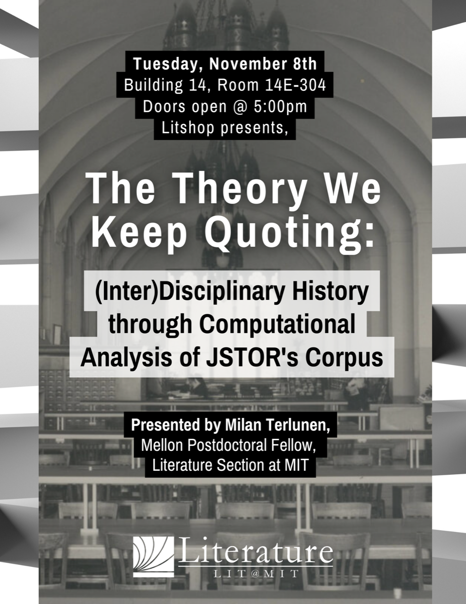 When: Tuesday, November 8th Where: Building 14, 14E-304 (map) Doors open @ 5:00pm; Introduction begins @ 5:15pm Presented by: Milan TerlunenMellon Postdoctoral Fellow, Literature Section at MITAbstract: I am investigating the passages from theory texts that scholars keep quoting, and ask what they reveal about the big ideas that have shaped the humanities in the last half century. Theory today, I argue, lives on primarily through such quoted passages. Within JSTOR's database of 12 million scholarly publications, I examine which exact words scholars have quoted again and again from theorists including Michel Foucault, Thomas Kuhn and Judith Butler, and how these patterns have varied over time and across disciplines. Based on my findings, I propose that frequently quoted theory passages play a crucial role in facilitating collective knowledge production, interdisciplinary connection and political contestation.​Non-MIT community members may respond to this email for a Tim Ticket in order to get access to the building.Image Description: Black and white text over black and white photo from JSTOR, Reading Room overview 1940s; behind it is a photo of white horizontal architectural rows/columns with gray shadows.
