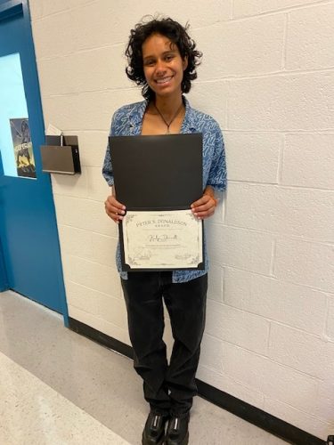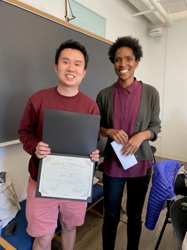 The Peter S. Donaldson Prize for Excellence in Literary Studies is awarded each spring at the last Lit Tea to Literature majors who excel academically and engage participants in the literary community at MIT. Professor Jessica Ruffin read some kind words about Jason Chen’s work in Literature. Literature Co-Head, Professor Sandy Alexandre, and advisor to Kaelyn Dunnell, also spoke glowingly about her advisee, who was unable to attend.